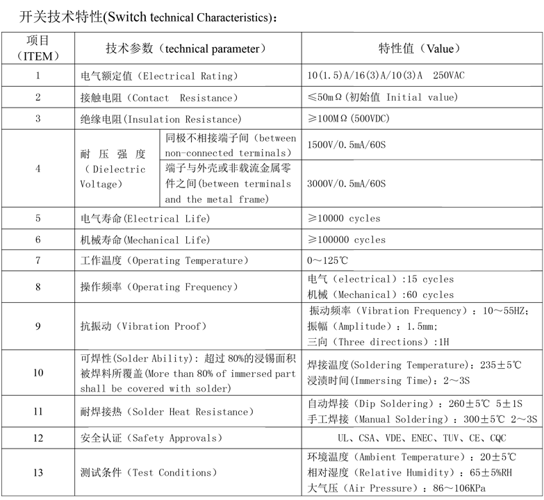 | 1 | Elektrisk vurdering | 10(1,5)A/16(3)A/10(3)A 250VAC | |